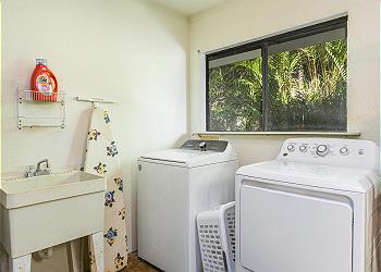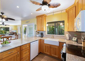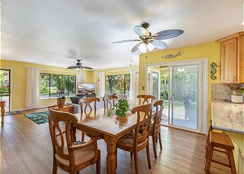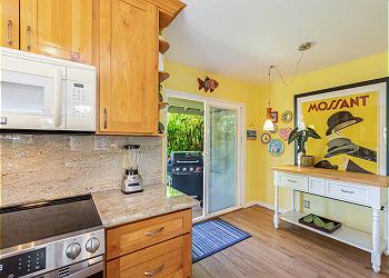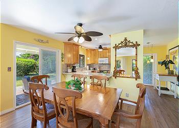 Enjoy preparing home cooked meals in the spacious, fully equipped kitchen, designed to handle everything from quick breakfasts to gourmet dinners. Hale Hauoli provides the perfect blend of convenience and relaxation. The covered lanai offers a peaceful place to unwind and is the perfect spot to sit back and Enjoy the island life. Equipped with a BBQ grill, enjoy meals outside or relax in the lounge chairs with your favorite book all while taking in the cool fresh air and lush garden views.