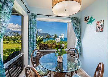 Reviewed on 2018-06-06 by Vicky D. , Orange, CAThis is our 6th trip to Kauai and our 4th stay in Pali Ke Kua #114. We have always loved the location with the most beautiful Bali Hai and ocean views. We also love the upgrades to #114 with the new granite countertops in the kitchen and bathroom and the new furniture. The beach chairs, umbrella and coolers were well used and greatly appreciated. We always enjoy making meals with a well stocked kitchen with the best ocean views. To say we love this condo is an understatement - we always have relaxing, peaceful vacations and have enjoyed amazing rainbows right in front of our condo including our first full rainbow that was breath taking. We will continue to return to this condo and highly recommend it!