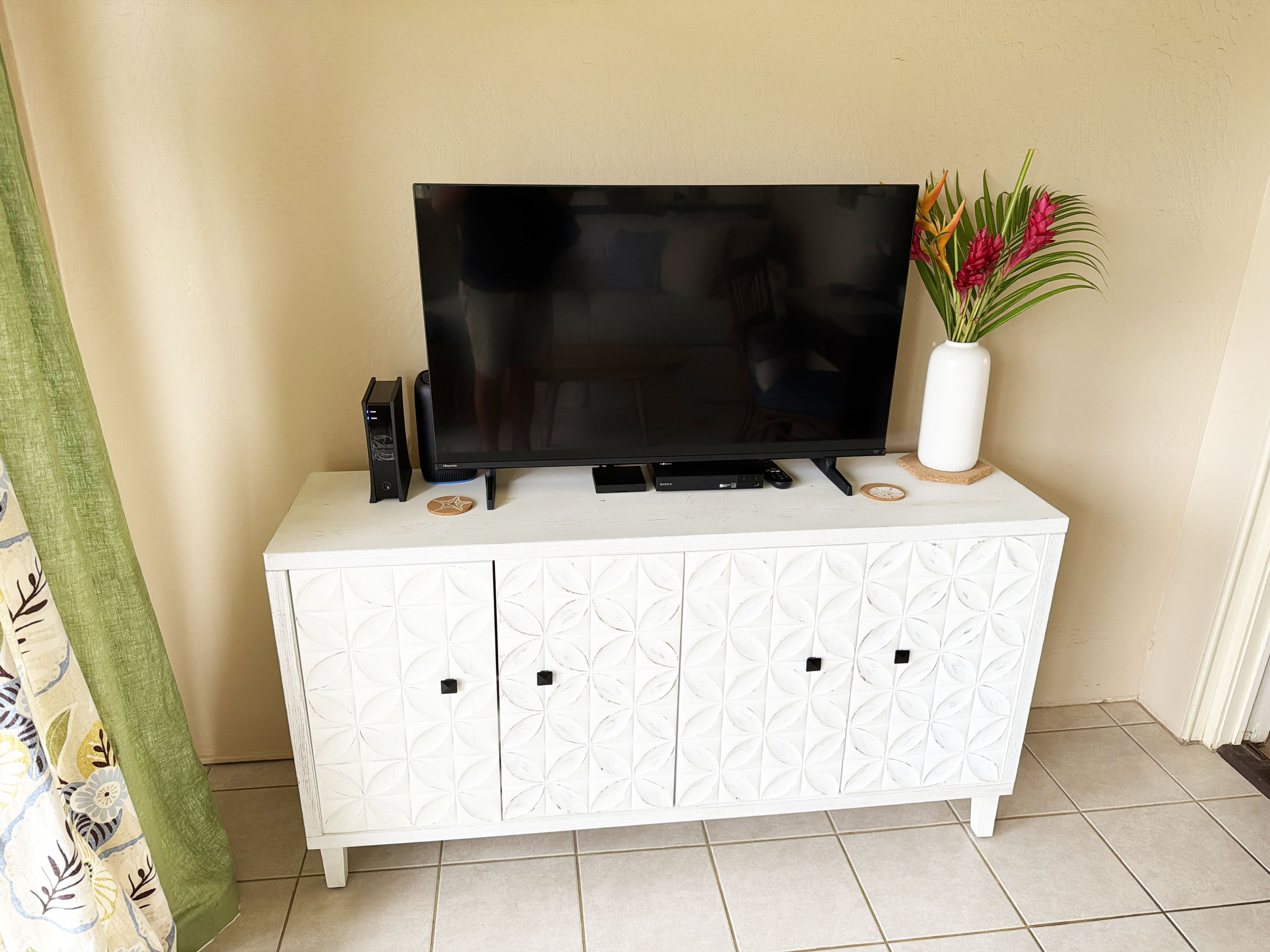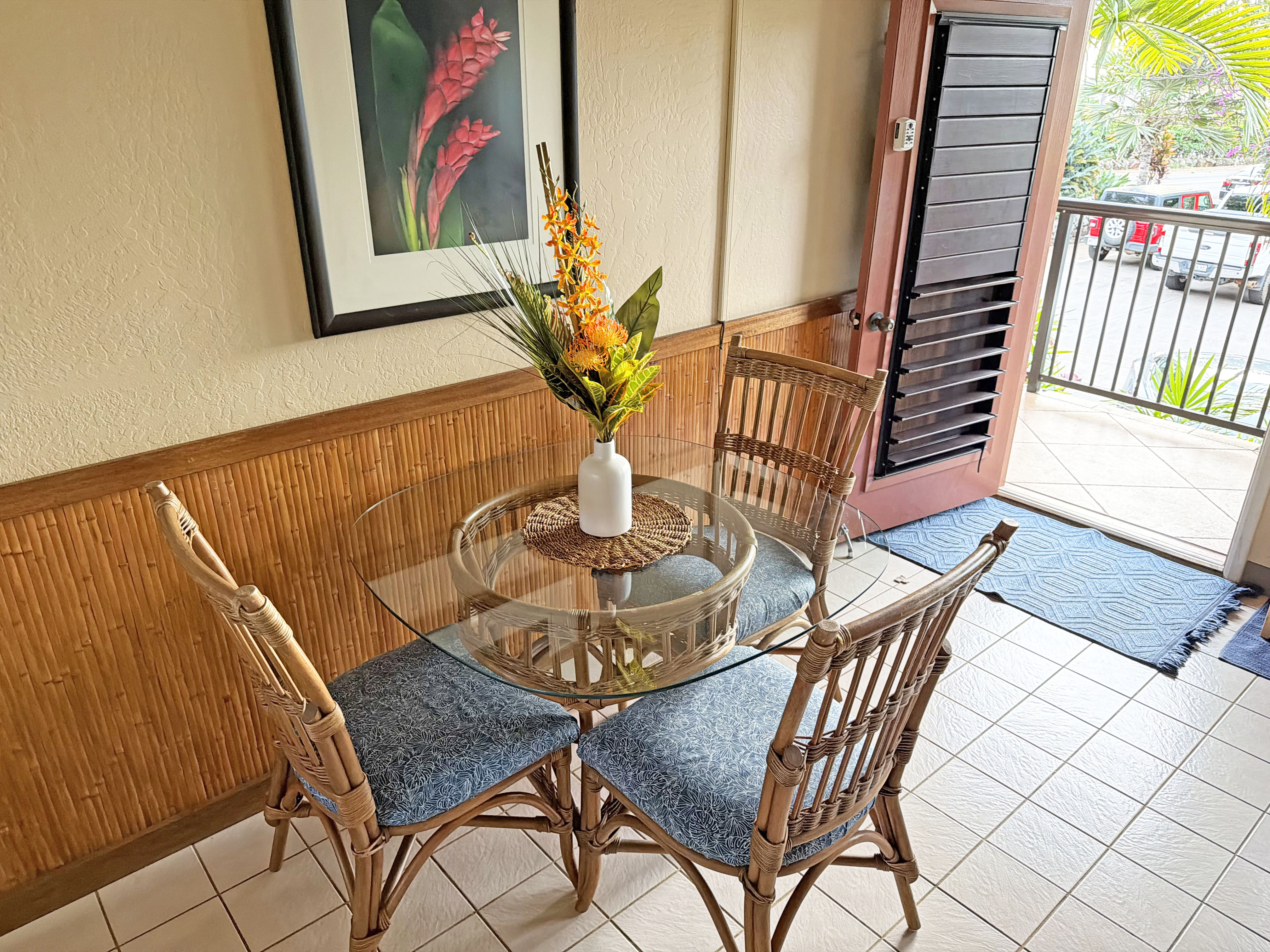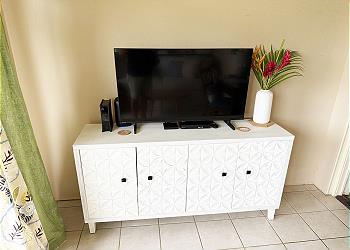 The condo is small and great for 2 people or a couple with one very young child, but not for more. The living room space off the "lanai" is overcrowded with a huge granny chair, an L shaped couch, 3 end tables, a desk, a chair, 2 bookshelves, and a large TV cabinet. It is stuffed and not what is featured in the photograph sadly. There are plenty of DVD movies available, not much for board games, and several helpful guide books on Kauai. There is no guest log for people to share tips and only the property management co. had a few helpful links. Kauai has SO many cool things to see and do, I would think any host/owner would want to share info.