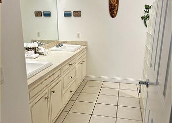 This wonderful home features two master suites with dual sinks in the bathrooms making it perfect for two couples. The third bedroom has two twin beds.